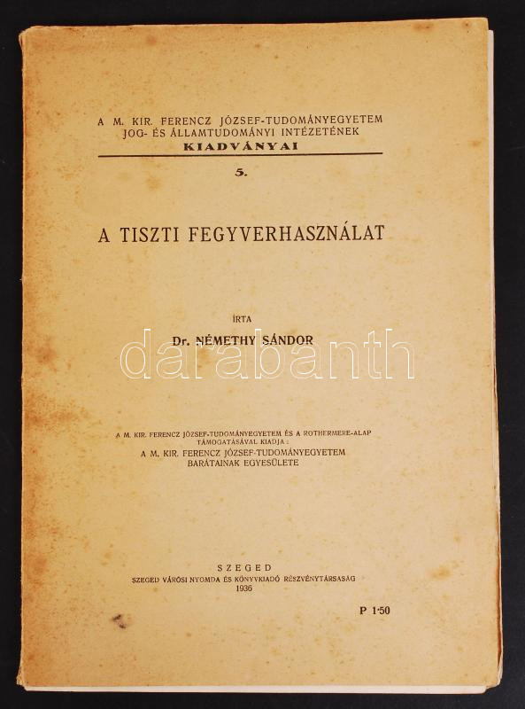 Dr. Némethy Sándor: A tiszti fegyverhasználat Szeged, 1936. Városi nyomda. 58p. hozzá uö: Párviadal és katonai büntetőjog; Szeged, 1936. Ablaka György 14p; hozzá uö. A tiszti fegyverhasználat problémái - különlenyomat