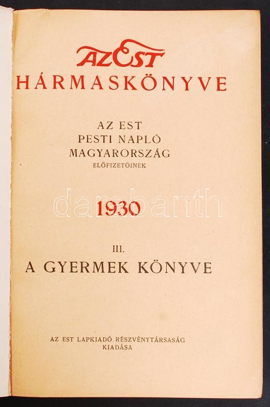 1930 Az Est hármaskönyve I.-II.-III. Közepes állapotban eredeti tékába... https://www.darabanth.com/de/203-Fernauktion/203.0/Andere-Sammelgebiete/Bucher-Sonstige-Raritaten~200038/1930-Az-Est-harmaskonyve-I-II-III-Kozepes-allapotban-eredeti-tekaban~II807763