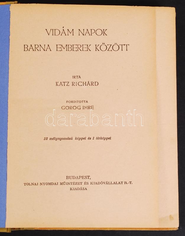 Katz Richárd: Vidám napok barna emberek között. Fordította Görög Imre. 32 mélynyomású képpel és 1 térképpel. Bp., 1929, Tolnai Nyomdai Műintézet és Kiadóvállalat. Újrakötött félvászon kötés, jó állapotban.