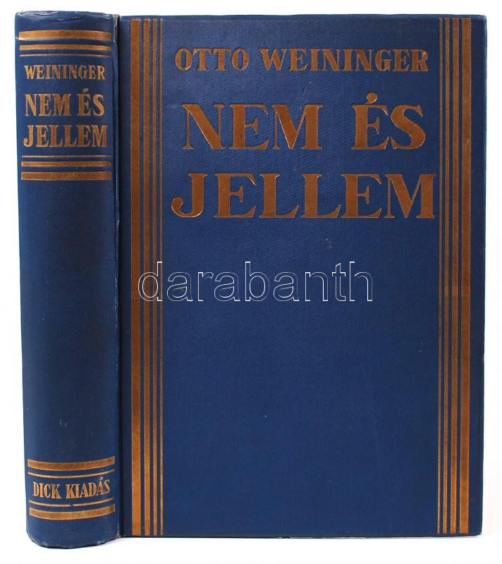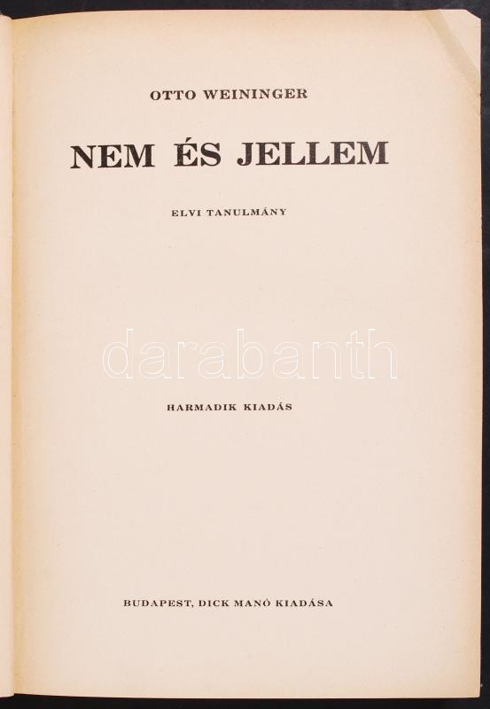 Otto Weininger: Nem és jellem Bp., Dick Manó Egészvászon kötésben https://www.darabanth.com/de/203-Fernauktion/203.0/Andere-Sammelgebiete/Bucher-Sonstige-Raritaten~200038/Otto-Weininger-Nem-es-jellem-Bp-Dick-Mano-Egeszvaszon-kotesben~II807788