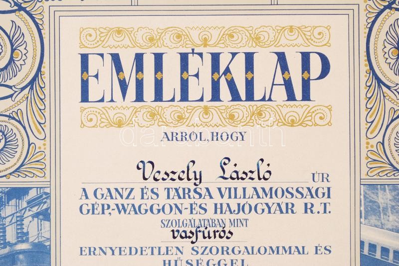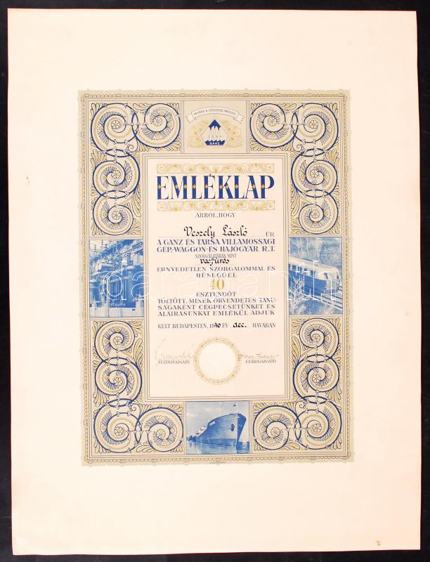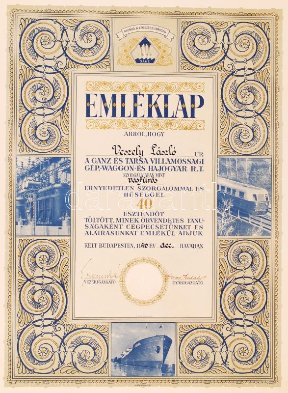 Beschreibung: 1940 Bp., A Ganz és Társa Villamossági Gép-, Waggon- és Hajógyár R.T. által vasfúrós számára kiállított díszes nagyméretű emléklap