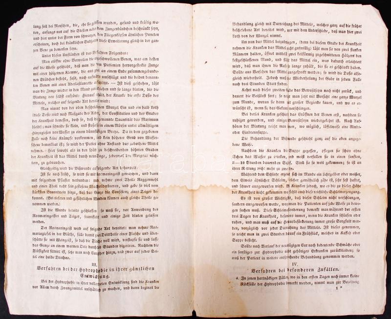 Beschreibung: 1809 Német nyelvű ismertető a veszettség kezeléséről embereknél és állatoknál, 5p.