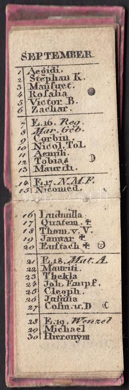 1823 Mignon almanach - miniatűr kalendárium, naptár megviselt kis téká... https://www.darabanth.com/de/203-Fernauktion/203.0/Andere-Sammelgebiete/Drucksachen~200041/1823-Mignon-almanach--miniatur-kalendarium-naptar-megviselt-kis-tekaban-1823-Miniature-cale~II796368