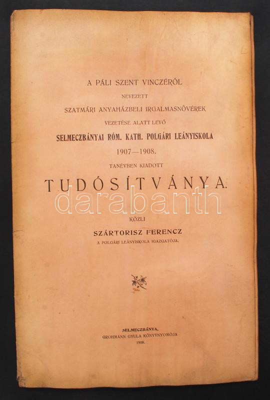1908 A PÁli Szent Vinczéről nevezett Szatmári Anyaházbeli Irgalmasnővérek vezetése alatt lévő Selmeczbányai Róm. Kath. Polgári Leányiskola 1907-1908. tanévben kiadott tudósítványa. Közli Szártorisz Ferencz a polgári leányiskola igazgatója, 42p.