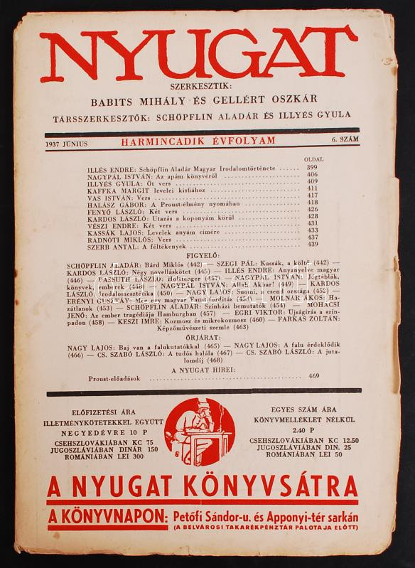 1937 Nyugat 1937 június, 30. évfolyam, 6. szám https://www.darabanth.com/de/203-Fernauktion/203.0/Andere-Sammelgebiete/Drucksachen~200041/1937-Nyugat-1937-junius-30-evfolyam-6-szam~II810521