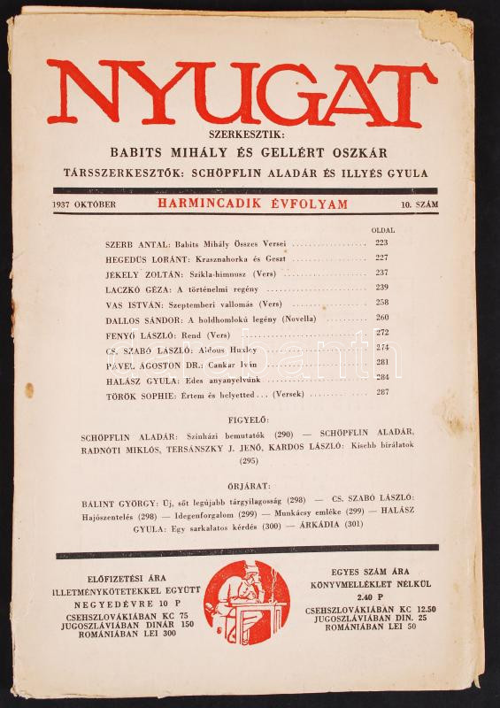 1937 Nyugat 1937 október, 30. évfolyam, 10. szám https://www.darabanth.com/de/203-Fernauktion/203.0/Andere-Sammelgebiete/Drucksachen~200041/1937-Nyugat-1937-oktober-30-evfolyam-10-szam~II810525