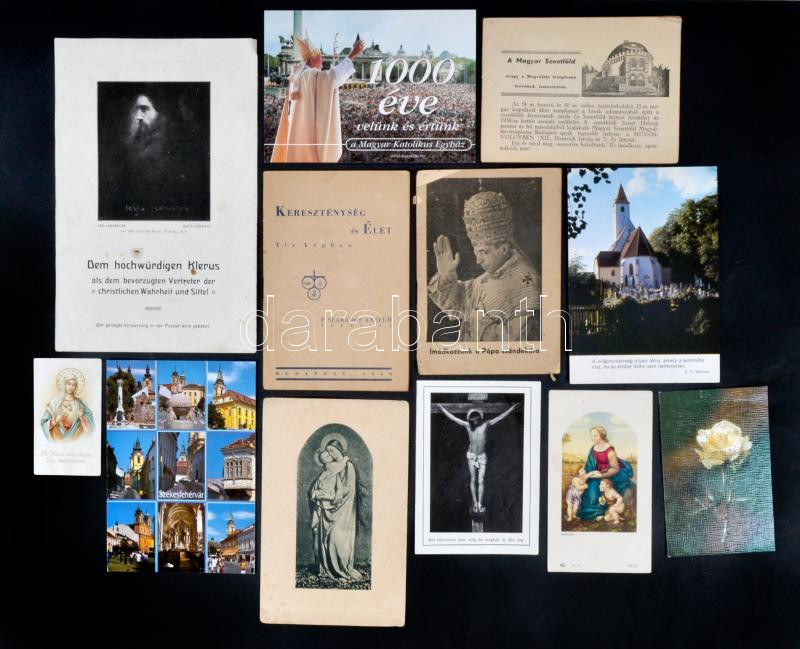 cca 1906-1984 Vegyes egyházi témájú nyomtatvány tétel (P. Szabados Anzelm: kereszténység és élet, A Magyar Szentföld, Imádkozzunk a pápa szándékára, Dem hochwürdigen Klerus, szentképek, képeslapok)