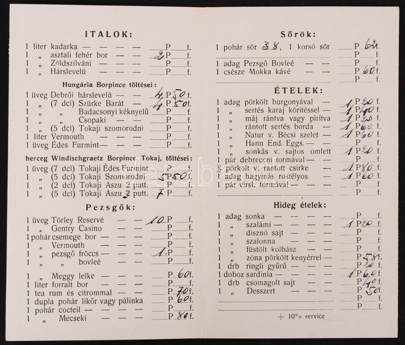 Beschreibung: cca 1930 Kiskunfélegyházi Fürdő Szálló étterme étlap