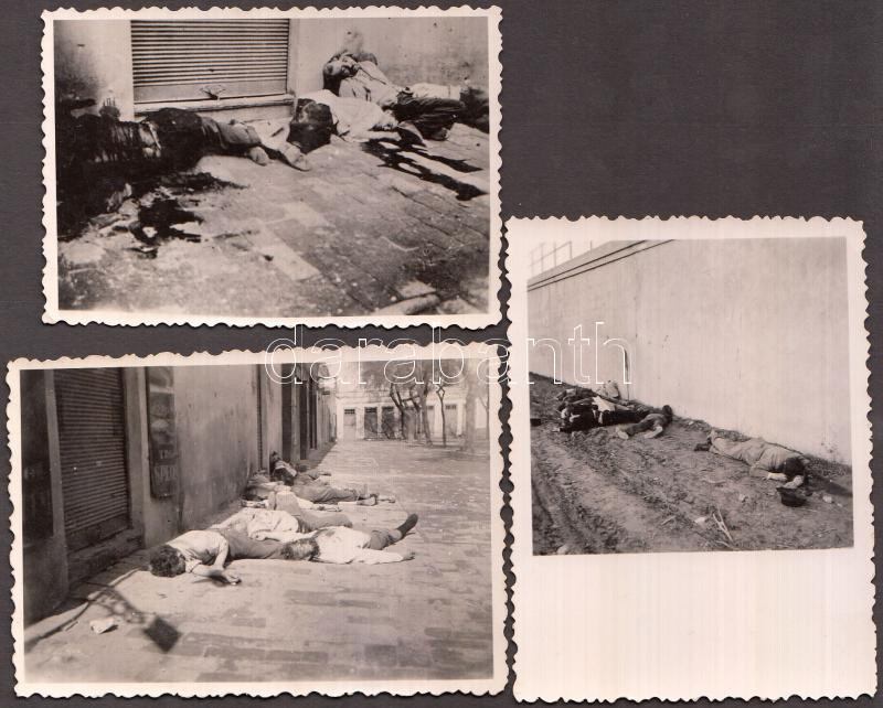 Beschreibung: 1944 A II. vh. polgári áldozatai, kivégzett emberek Újvidéken és Zomboron, 3 db fénykép, 6x6 cm és 6x8 cm közötti méretekben