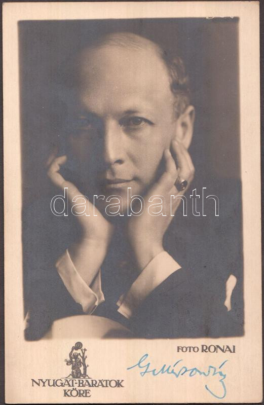 cca 1920-1930 Rónai Dénes (1875-1964): Gellér Oszkár költő, író, szerkesztő portréképe, vintage fotó, a Nyugat-barátok köre fotósorozat része, a modell által aláírva, fotóképeslap, 9x14 cm