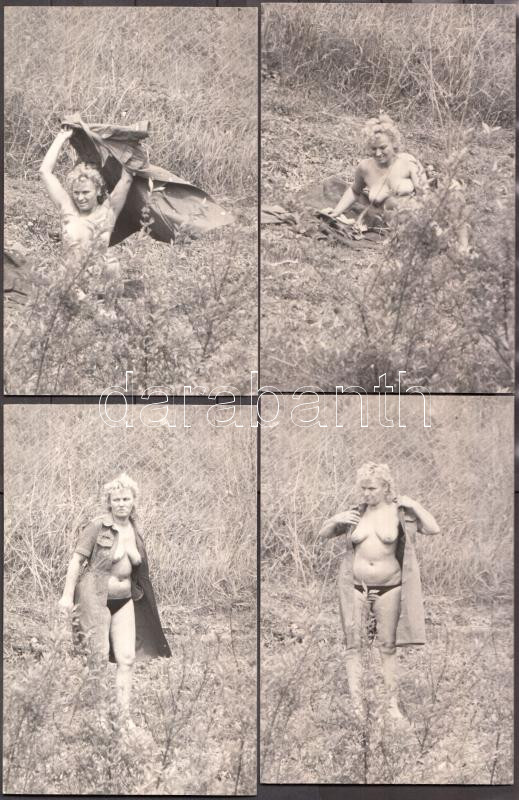 cca 1960-1970 Magyar paparazzi fotók egy gyárudvar elhagyott zugáról, ahol délidőben a raktáros hölgy diszkrét napozásra vágyott, 6 db /
