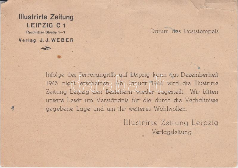Beschreibung: 1943 A lipcsei Illustrierte Zeitung kiadójának tájékoztató levelezőlapja a decemberi szám terrorbombázások miatti kimaradásáról