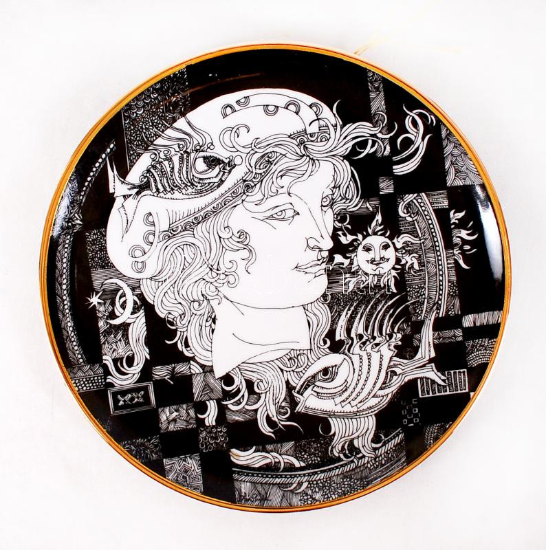 Hollóházi Szász Endre tervezte falitányér, matricás, jelzett, hibátlan... https://www.darabanth.com/de/203-Fernauktion/203.0/Andere-Sammelgebiete/Porzellan~200006/Hollohazi-Szasz-Endre-tervezte-falitanyer-matricas-jelzett-hibatlan-d20-cm~II809523