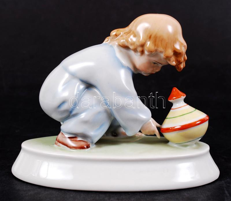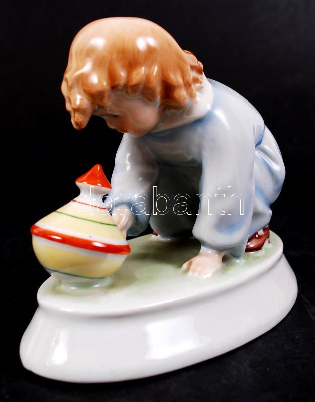 Beschreibung: Zsolnay búgócsigával játszó gyerek. kézzel festett, jelzett (Sinkó), hibátlan, 13×15 cm/ Handpainted Zsolnay chinaware figure in flawless condition