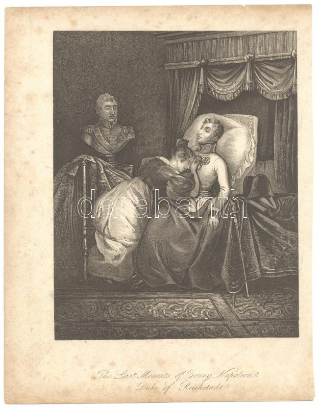 cca 1840 The Last Moments of Young Napoleon, Duke of Reichstadt. II. Napóleon, Reichstadt hercege halálos ágyán. Akvatinta, rézkarc /