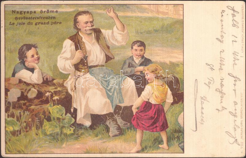 1899 'Nagyapa öröme, Grossvatersfreuden' Kosmos, Budapest / ... https://www.darabanth.com/de/203-Fernauktion/203.0/Ansichtskarten/Folklore~600333/1899-Nagyapa-orome-Grossvatersfreuden-Kosmos-Budapest-Hungarian-folklore-litho~II811835