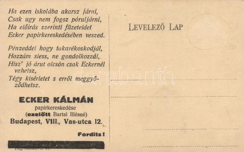 Beschreibung: Budapest VIII. Vass utca, Községi Felső Kereskedelmi Iskola, hátoldalon Ecker Kálmán reklámja (fl)