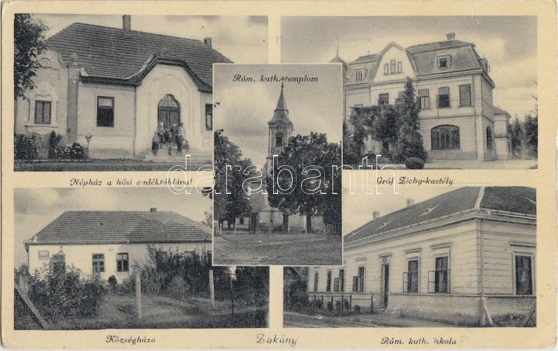 Beschreibung: Zákány, Népház a hősi emléktáblával, Római katolikus templom és iskola, Gróf Zichy kastély, községháza