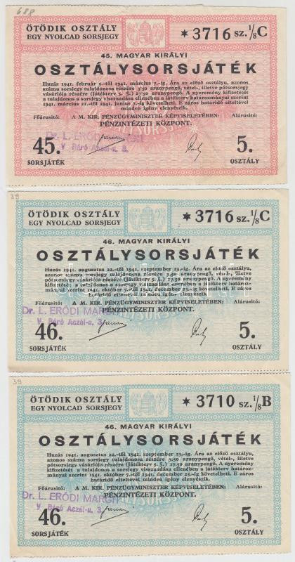 1941. "46. + 46. Magyar Királyi Osztálysorsjáték" 5. osztály... https://www.darabanth.com/de/203-Fernauktion/203.0/Numismatik/Aktien-und-Tickets~6/1941-46-plus-46-Magyar-Kiralyi-Osztalysorsjatek-5-osztaly-18-sorsjegye-3x-TII-II-~II812306
