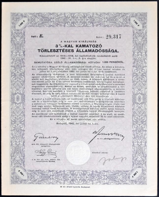 Budapest 1942. 1000P "3%-kal kamatozó állami nyereménykölcsön - á... https://www.darabanth.com/de/203-Fernauktion/203.0/Numismatik/Aktien-und-Tickets~6/Budapest-1942-1000P-325-kal-kamatozo-allami-nyeremenykolcson--allamadossagi-kotveny-2x~II812316