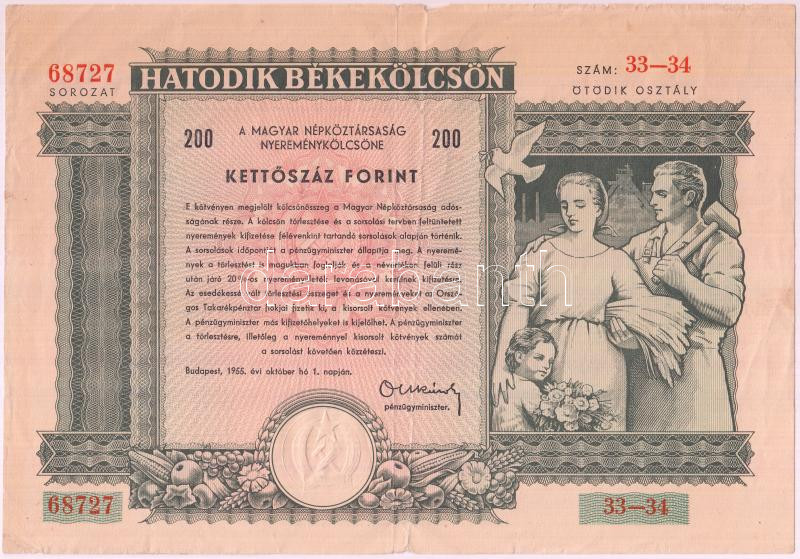 Beschreibung: Budapest 1955. "Hatodik Békekölcsön" nyereménykölcsöne 200Ft-ról T:III