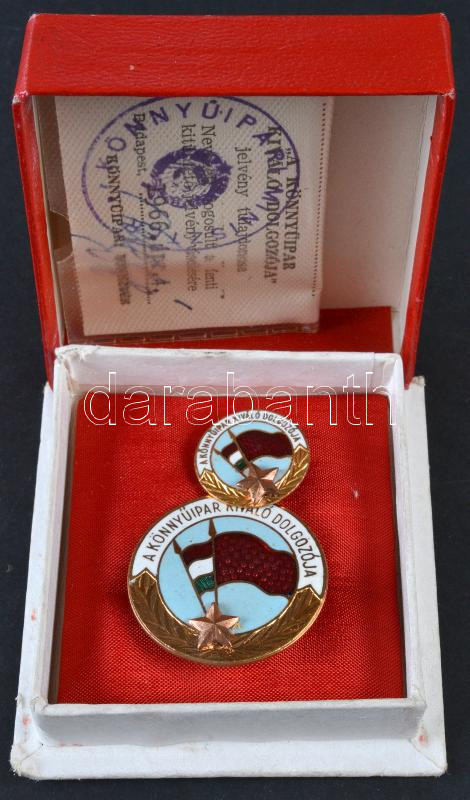 ~1970. "Könnyűipar Kiváló Dolgozója" tűzzománc kitüntetés kitűzővel dísztokban, adományozói irattal T:1