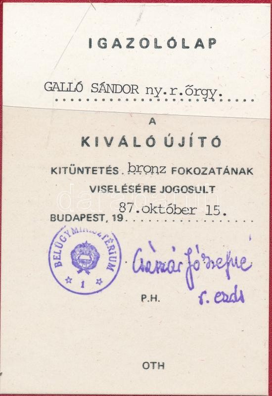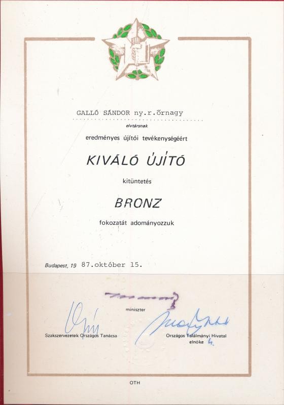 ~1987. "Kiváló Újító" kitüntetés bronz fokozata miniatűrrel tokban és adományozói okirattal T:1