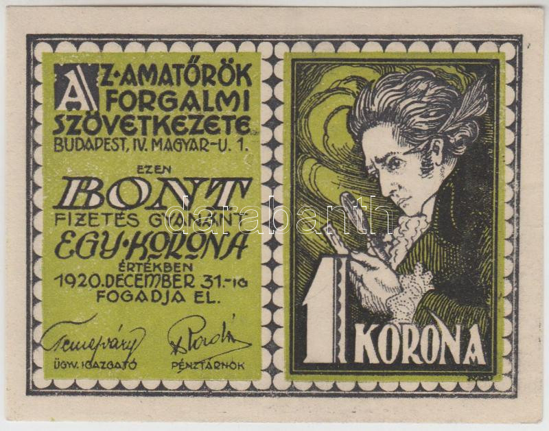 Budapest 1920.12.31. 1K "Amatőrök Forgalmi Szövetkezete" T:I https://www.darabanth.com/de/203-Fernauktion/203.0/Numismatik/Notgelden~7/Budapest-19201231-1K-Amatorok-Forgalmi-Szovetkezete-TI~II812269