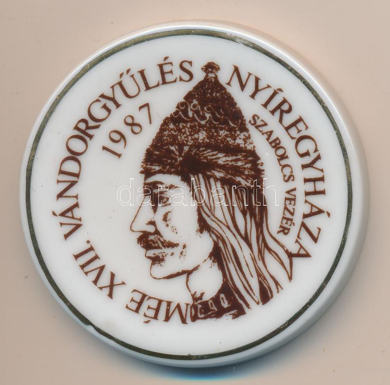 Beschreibung: Tóth Sándor (1933-) 1987. "MÉE XVII. Vándorgyűlés Nyíregyháza - Szabolcs Vezér" Hollóházi porcelán emlékplakett T:1