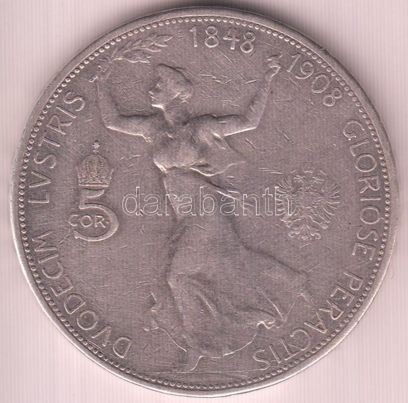 Austria 1908. 5 Coron... https://www.darabanth.com/de/203-Fernauktion/203.0/Numismatik/Weltweit-Munzen~13/Ausztria-1908-5K-Ag-Jubileum-T2-3-3Cbr3EAustria-1908-5-Corona-Ag-Jubilee-CVF-F-3Cbr3EKrause-K~II811033