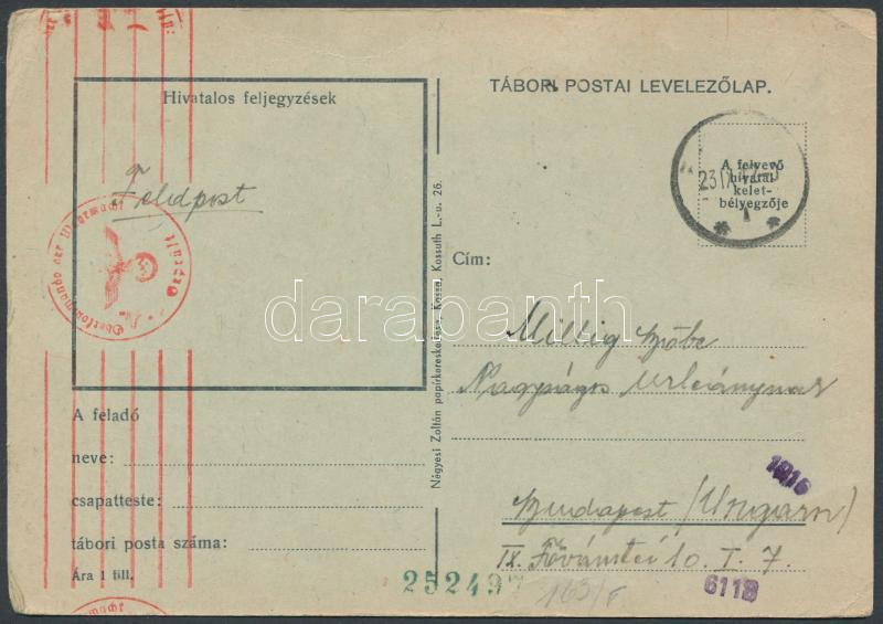 1942 Tábori lap Baranovicéből (Belorusszia) német tábori postán feladv... https://www.darabanth.com/de/203-Fernauktion/203.0/Philatelie/Pengo-Periode-1926-1944~600033/1942-Tabori-lap-Baranovicebol-Belorusszia-nemet-tabori-postan-feladva-Wehrmacht-cenzurava~II746519