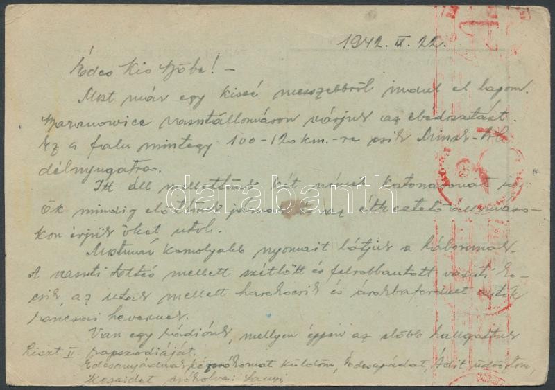 Beschreibung: 1942 Tábori lap Baranovicéből (Belorusszia) német tábori postán feladva, Wehrmacht cenzúrával Budapestre, érdekes tartalommal