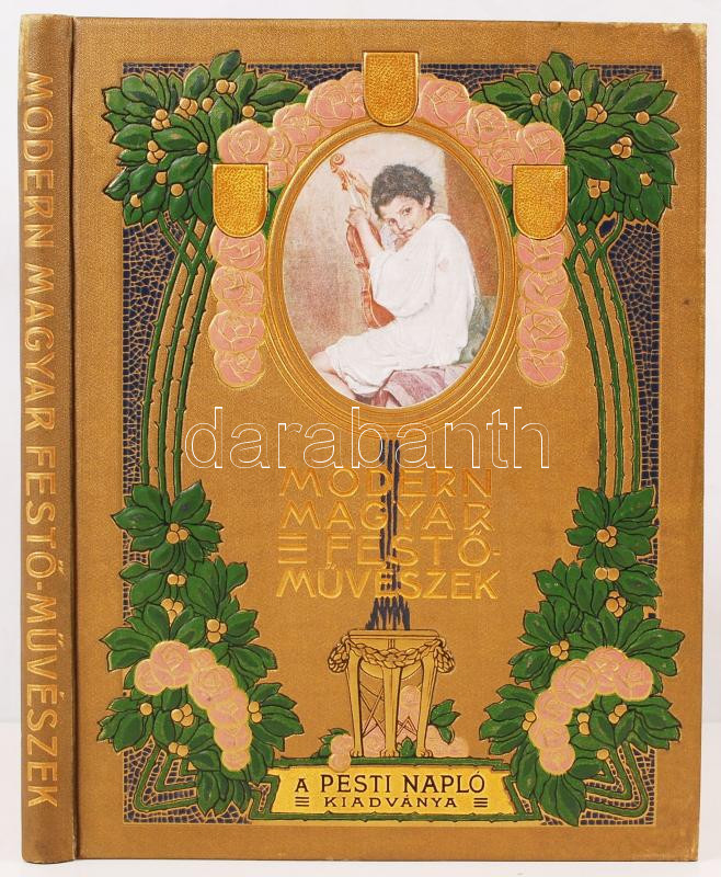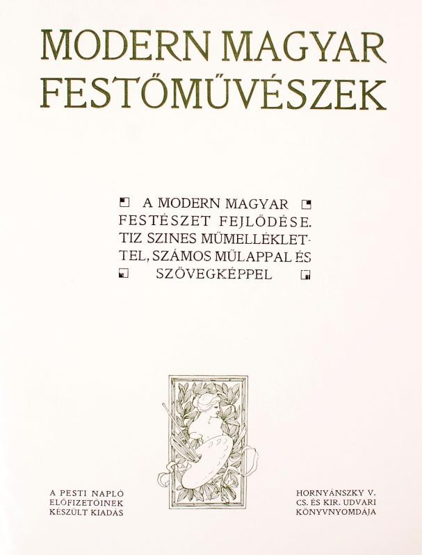 Modern magyar festőművészek. A modern magyar festészet fejlődése. Tíz színes műmelléklettel, számos műlappal és szövegképpel. A Pesti Napló előfizetőinek készült kiadás. Bp.,(1905), Hornyánszky. Illusztrált, kiadói aranyozott, dombornyomott, egészvászon kötés, jó állapotban.