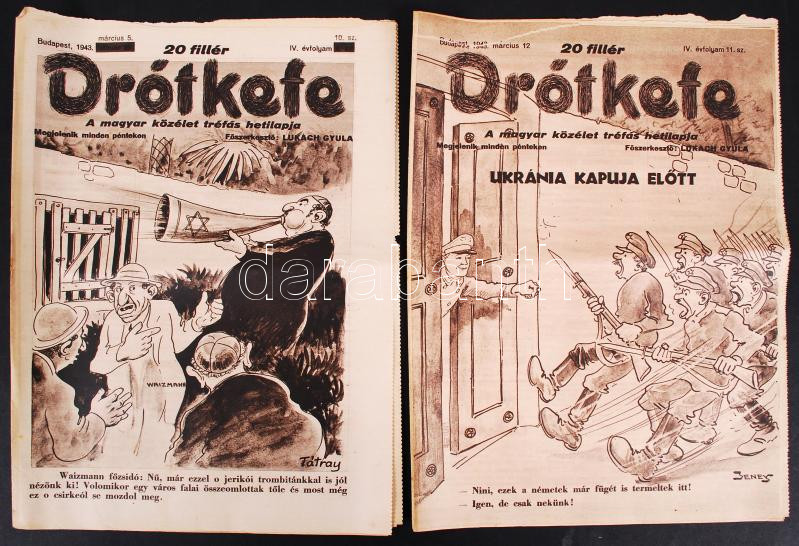 1943 A Drótkefe c. antiszemita élclap 3 száma jó állapotban https://www.darabanth.com/de/204-Fernauktion/204.0/Andere-Sammelgebiete/Drucksachen~400015/1943-A-Drotkefe-c-antiszemita-elclap-3-szama-jo-allapotban~II802266