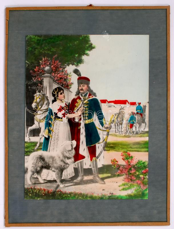 Beschreibung: cca 1920-1930 Búcsúban árusított lakásdekoráció: II. Rákóczi Ferencről, képméret 4x18 cm, üveglap alatti karton 32x24 cm