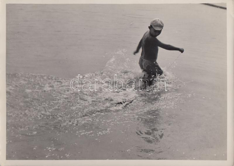 Beschreibung: cca 1930-1935 Kinszki Imre (1901-1945): Játék a vízben, vintage fotó gyermekéről, pecséttel jelzett, 13x18 cm