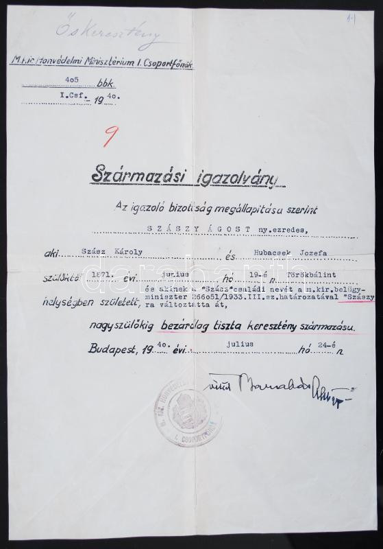 1940 Származási igazolvány Szászy Ágost ny. ezredes https://www.darabanth.com/de/204-Fernauktion/204.0/Andere-Sammelgebiete/Militaria~400011/1940-Szarmazasi-igazolvany-Szaszy-Agost-ny-ezredes~II802228