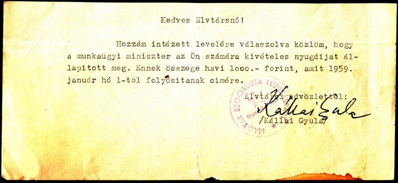 Beschreibung: 1959 Kállai Gyula miniszterelnök (1965-1967) aláírása levélen