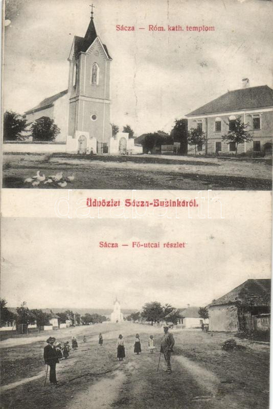 Beschreibung: Saca, Sácza-Buzinka; Katolikus templom, Főutca / church, main steret (fa)