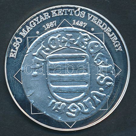 Beschreibung: DN "A magyar nemzet pénzérméi - Első magyar kettős verdejegy 1387-1437." Ag (0,999) emlékérem (10,37g/35mm) T:PP tanúsítvánnyal!