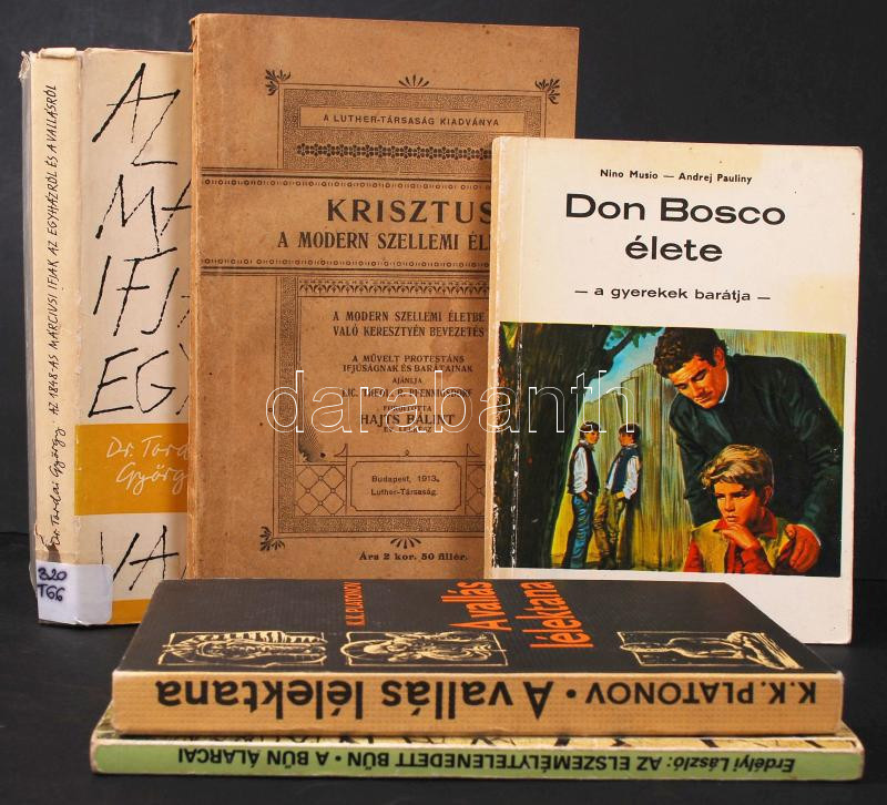 5 db könyv-Erdélyi László: Az elszemélytelenedett bűn, A bűn álarcai. Bp. 1987, Adventista Egyház;Nino Musio-Andrej Pauliny: Don Bosco élete-a gyerekek barátja. Fordította: Tury Lajos. Bp., Ecclesia; Lic. Theol. R. Pfenningsdorf: Krisztus a modern szellemi életben. Fordította: Hajts Bálint ev. lelkészv. Bp., 1913, Luther Társaság; K.K. Platonov: A vallás lélektana. Bp., 1968, Kossuth; Dr. Tordai György: Az 1848-as márciusi ifjak az egyházról és a vallásról.