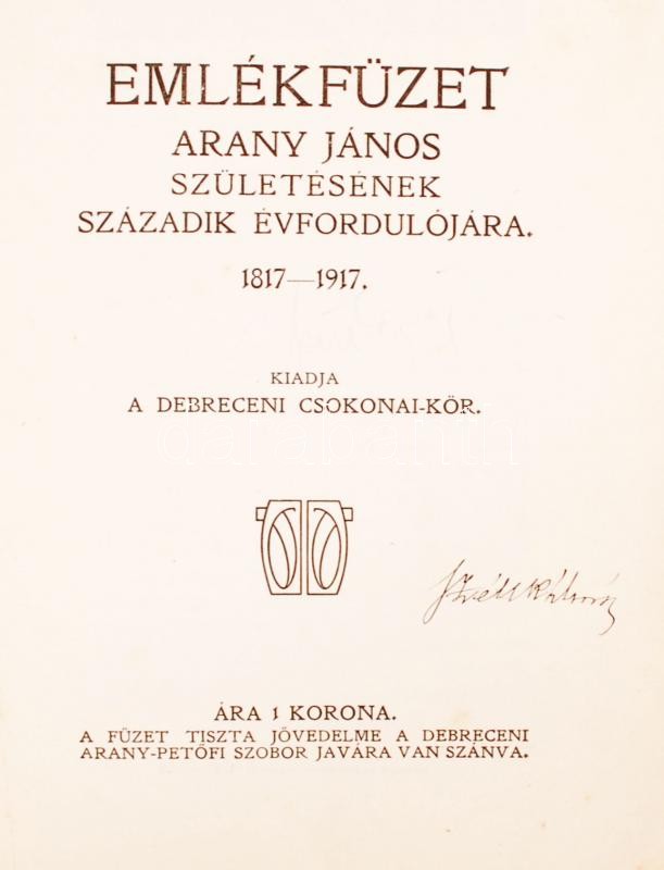Emlékfüzet Arany János születésének századik évfordulójára 1817-1917. ... https://www.darabanth.com/de/205-Fernauktion/205.0/Andere-Sammelgebiete/Bucher-Sonstige-Raritaten~34/Emlekfuzet-Arany-Janos-szuletesenek-szazadik-evfordulojara-1817-1917-Debrecen-1917-Csok~II825212