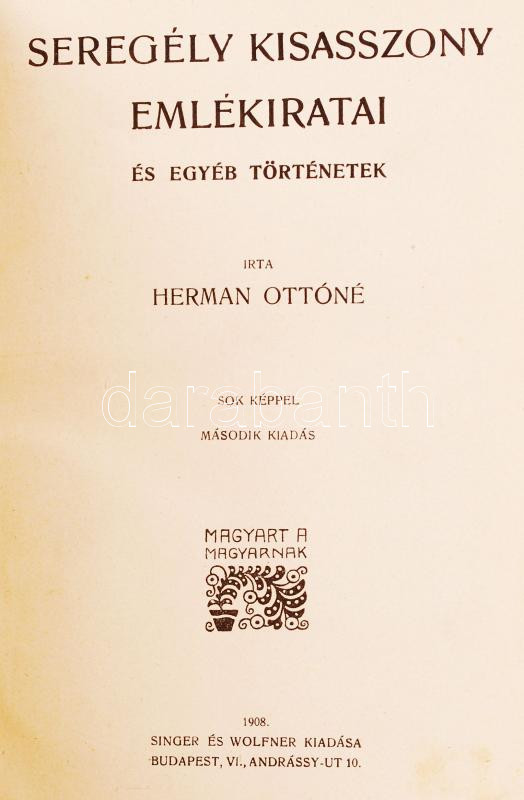Herman Ottóné: Seregély kisasszony emlékiratai és egyéb történetek. Sok képpel, második kiadás. Bp., 1908, Singer és Wolfner. Illusztrált, félvászon kötés, jó állapotban.