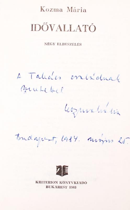 Kozma Mária: Idővallató; Dedikált! Bukarest, 1983. Kriterion https://www.darabanth.com/de/205-Fernauktion/205.0/Andere-Sammelgebiete/Bucher-Sonstige-Raritaten~34/Kozma-Maria-Idovallato-Dedikalt-Bukarest-1983-Kriterion~II808117
