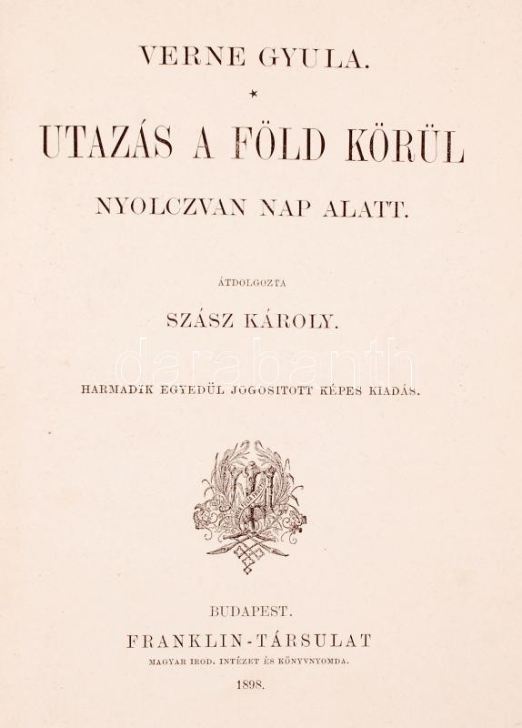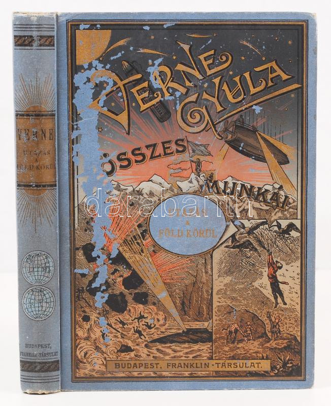 Verne Gyula: Utazás a Föld körül nyolczvan nap alatt. Harmadik egyedül jogosított képes kiadás. Bp., 1898, Franklin-Társulat. Illusztrált, kiadói aranyozott, festett egészvászon kötés, festés kissé kopottas, egyébként jó állapotban.