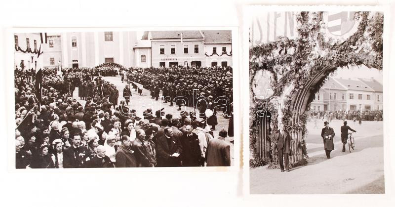 Beschreibung: 1938 A Felvidék felszabadulásának emlékére kiadott fotólap Rozsnyóról és egy privát fénykép, az ünnepélyes bevonulásra készített díszkapuról, 11x9 cm