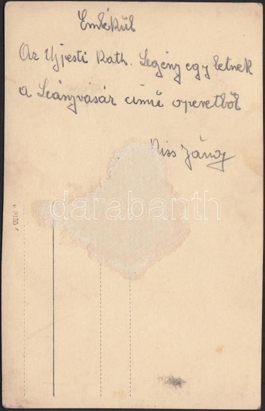 Beschreibung: cca 1900-1910 Kiss János operett énekes dedikált fényképe, amelyet az Újpesti Katholikus Legényegyletnek címzett a Leányvásár operettből, 13x9 cm