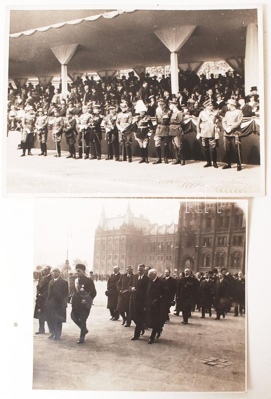 cca 1936 Beller Rezső: Mussolini(?) Budapesten, az országház előtt; diplomáciai kar, katonai attasék az átkeresztelt Oktogonon, azaz Mussolini téren, 2 db vintage riportfotó, 17x18 cm és 18x24 cm