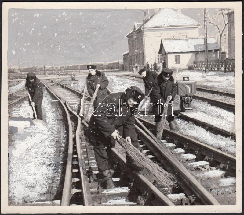 cca 1950-1960 Egy vasútállomás váltórendszerének tisztítása télen, a h... https://www.darabanth.com/de/205-Fernauktion/205.0/Andere-Sammelgebiete/Foto~44/cca-1950-1960-Egy-vasutallomas-valtorendszerenek-tisztitasa-telen-a-hatter-es-a-havas-f~II822626