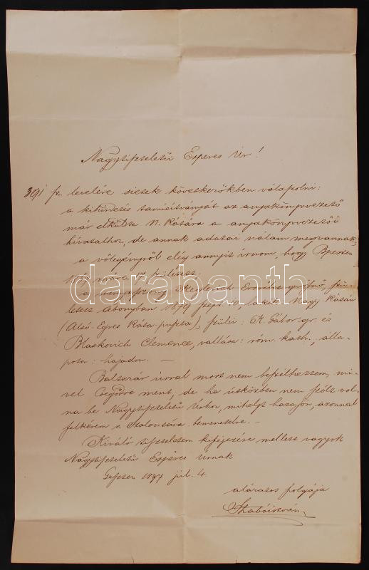 1897 Szabó István geszti lelkipásztor levele Szél Kálmán református es... https://www.darabanth.com/de/205-Fernauktion/205.0/Andere-Sammelgebiete/Historische-Dokumenten-Handschriften~41/1897-Szabo-Istvan-geszti-lelkipasztor-levele-Szel-Kalman-reformatus-esperesnek-Arany-Janos-~II824062